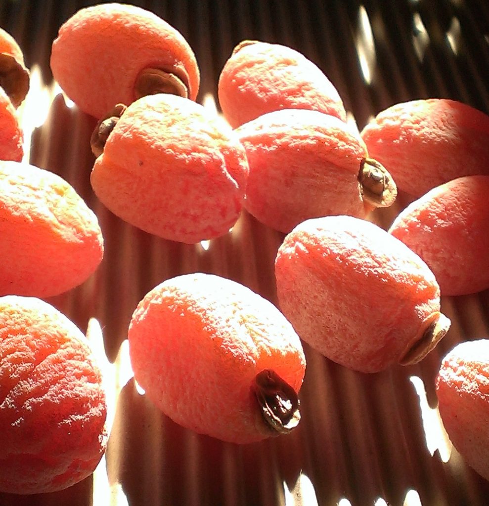 ていねいな柿もみと寝せ込みを繰り返すと、白い粉(ブドウ糖)に覆われた干し柿が出来上がります。