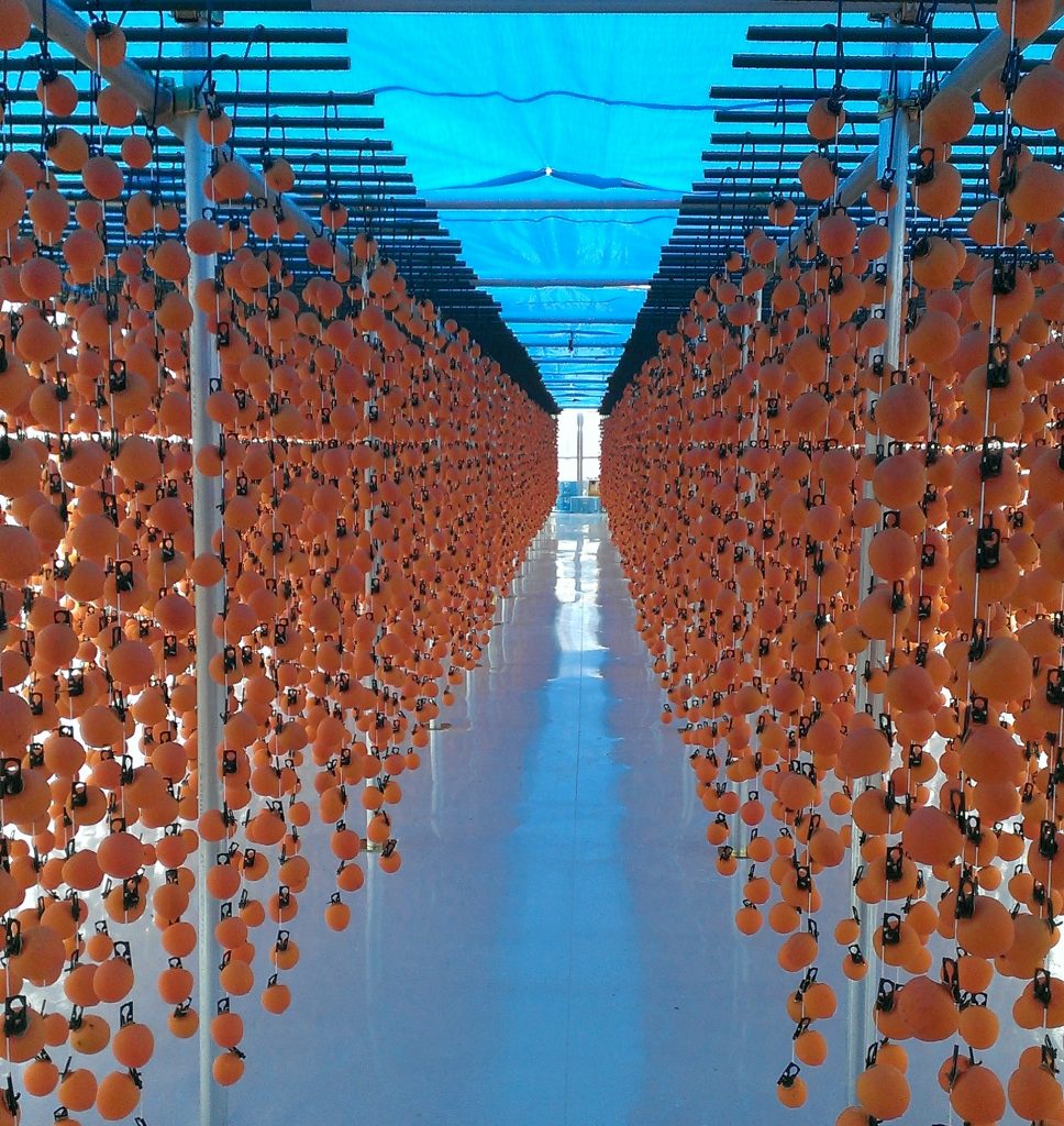 ハウスで1ヶ月程乾燥します。乾燥期間中は湿気が多いとカビが発生しやすく、乾燥しすぎても渋味が抜けにくくなってしまうため、天気をみながら窓を開閉したり、のれんの間隔を調節したりと、適切な温度と湿度を保つよう工夫します。
